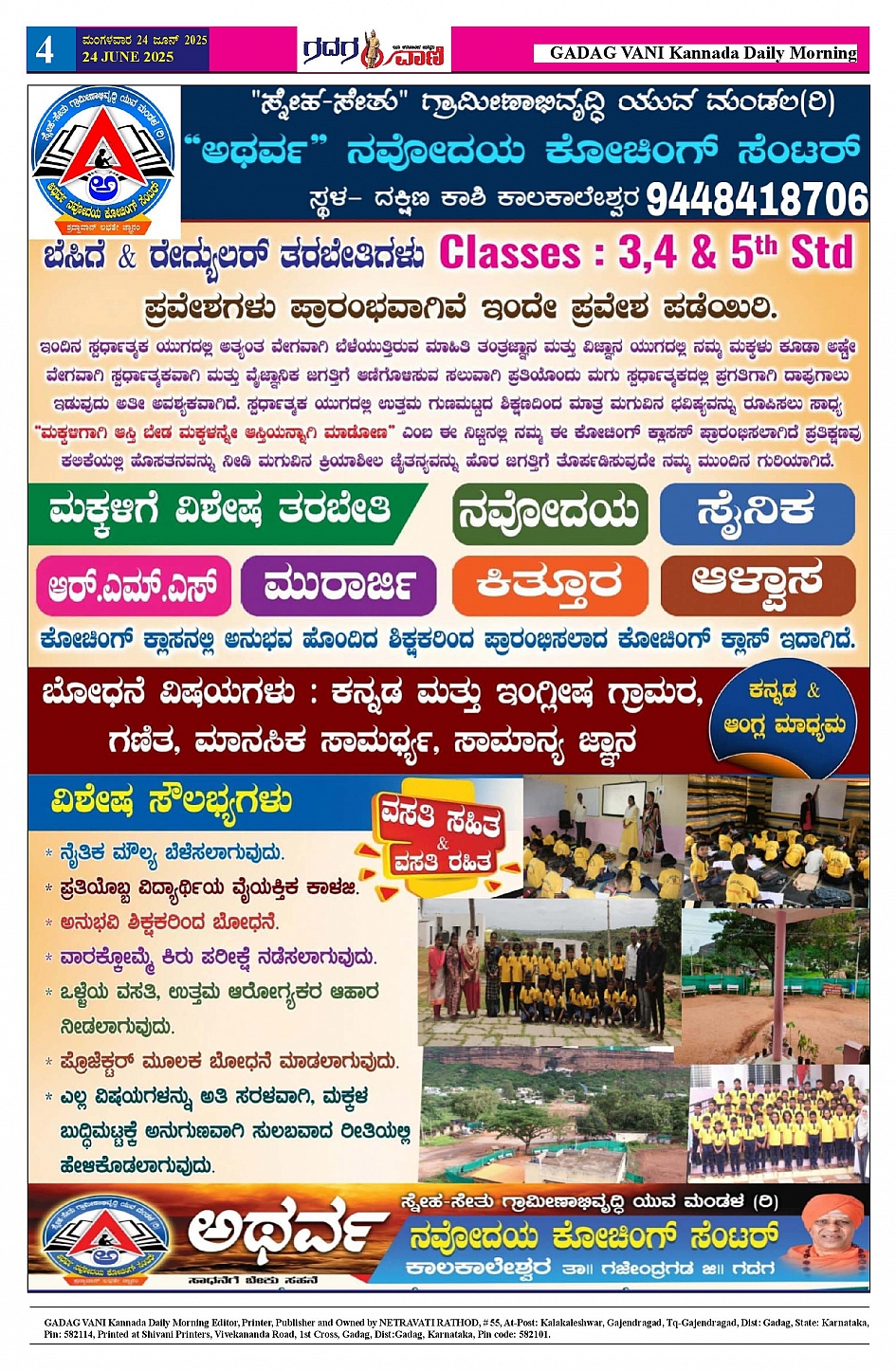 24 June 2025 ಗದಗವಾಣಿ Page: 4 June 24, 2025 << First << 4 >> Last >> Page 1Page 2Page 3Page 4 × 24 June 2025 ಗದಗವಾಣಿ 12324.06. 2025 GADAGVANI PG 04-page-004 << First << 4 >> Last >> 12324.06. 2025 GADAGVANI PG 04-page-004 24.06. 2025 GADAGVANI PG 04-page-004