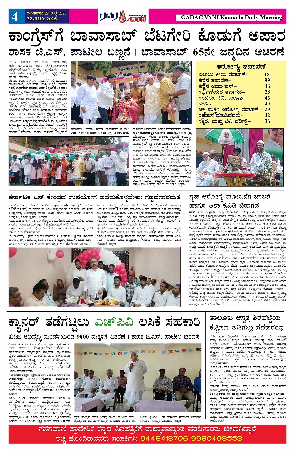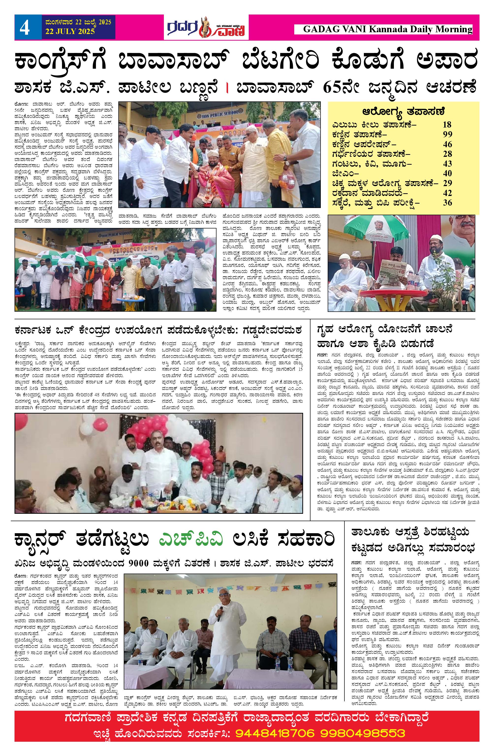 22 July 2025 ಗದಗವಾಣಿ Page: 4 July 22, 2025 << First << 4 >> Last >> Page 1Page 2Page 3Page 4Page 5Page 6 × 22 July 2025 ಗದಗವಾಣಿ 1234522.07.2025 GADAGVANI PG 06 NEW-page-006 << First << 4 >> Last >> 1234522.07.2025 GADAGVANI PG 06 NEW-page-006 4