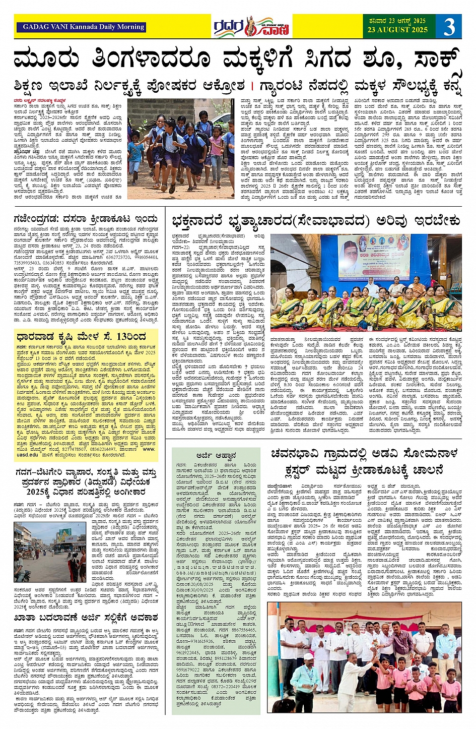 23 AUG 2025 ಗದಗವಾಣಿ Page: 3 August 23, 2025 << First << 3 >> Last >> Page 1Page 2Page 3Page 4Page 5Page 6 × 23 AUG 2025 ಗದಗವಾಣಿ page-1page-2page-3page-4page-5page-6 << First << 3 >> Last >> page-1page-2page-3page-4page-5page-6 page-3