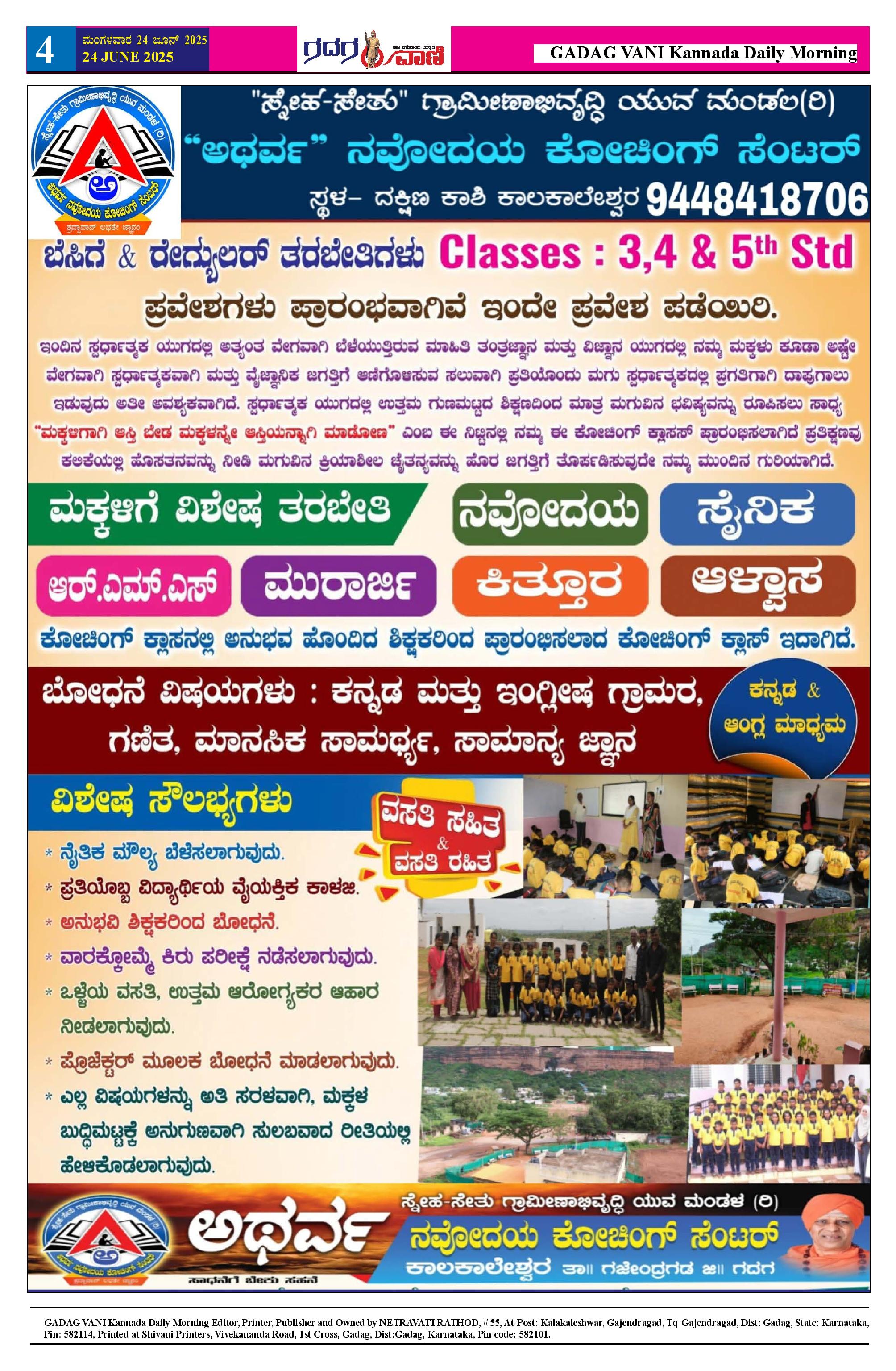 24 June 2025 ಗದಗವಾಣಿ Page: 4 June 24, 2025 << First << 4 >> Last >> Page 1Page 2Page 3Page 4 × 24 June 2025 ಗದಗವಾಣಿ 12324.06. 2025 GADAGVANI PG 04-page-004 << First << 4 >> Last >> 12324.06. 2025 GADAGVANI PG 04-page-004 24.06. 2025 GADAGVANI PG 04-page-004