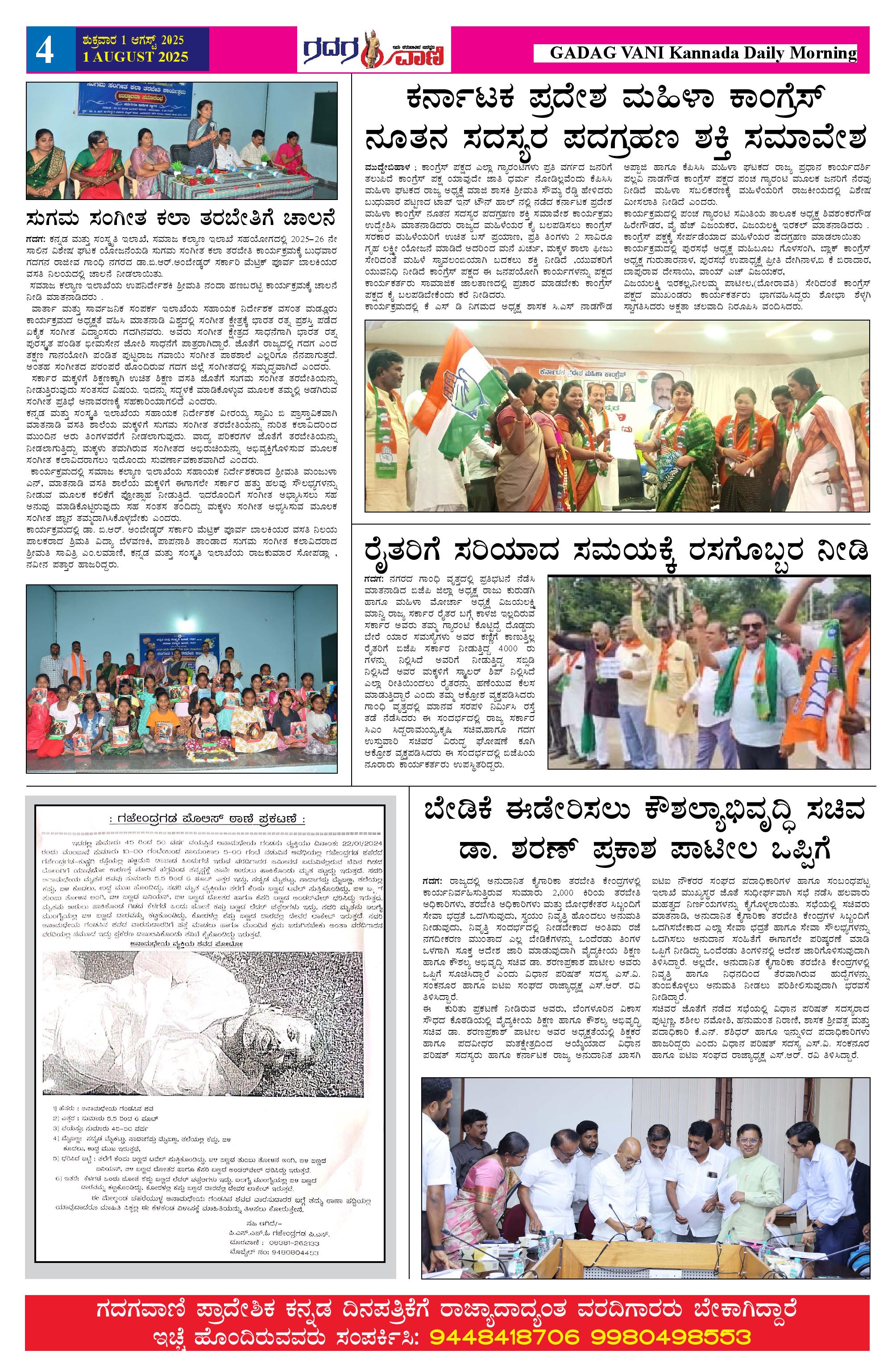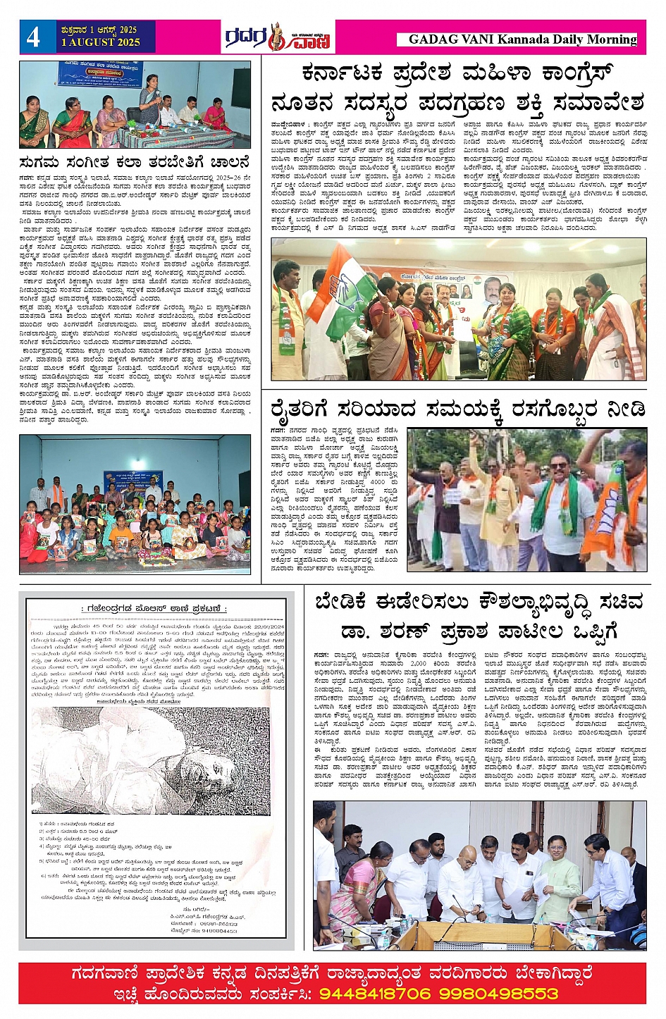 01 AUG 2025 ಗದಗವಾಣಿ Page: 4 August 01, 2025 << First << 4 >> Last >> Page 1Page 2Page 3Page 4Page 5Page 6 × 01 AUG 2025 ಗದಗವಾಣಿ 1234501.08.2025 GADAGVANI PG 06 NEW-page-006 << First << 4 >> Last >> 1234501.08.2025 GADAGVANI PG 06 NEW-page-006 4