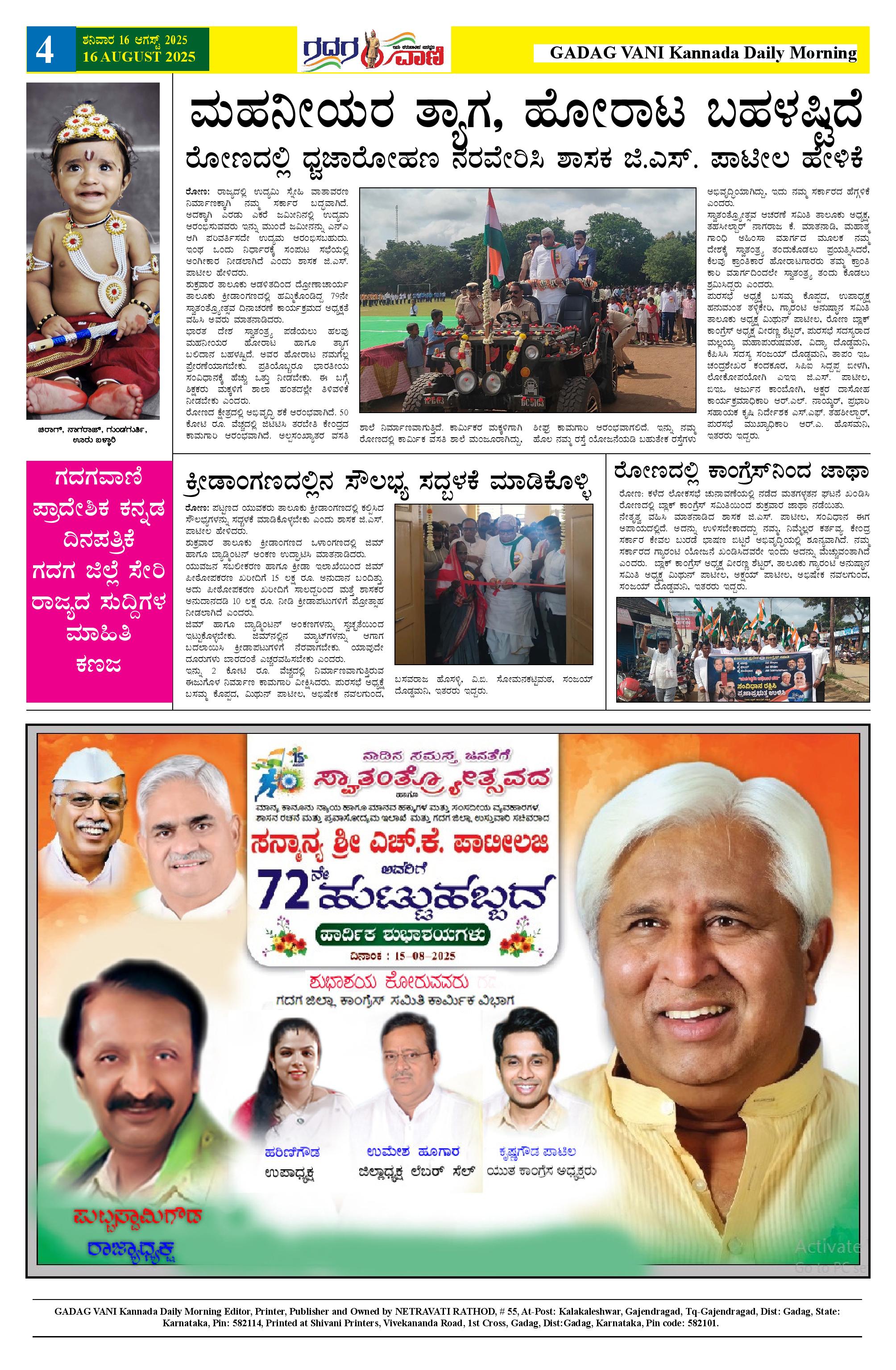 16 AUG 2025 ಗದಗವಾಣಿ Page: 4 August 16, 2025 << First << 4 >> Last >> Page 1Page 2Page 3Page 4Page 5Page 6 × 16 AUG 2025 ಗದಗವಾಣಿ page-1page-2page-3page-4page-5page-6 << First << 4 >> Last >> page-1page-2page-3page-4page-5page-6 page-4