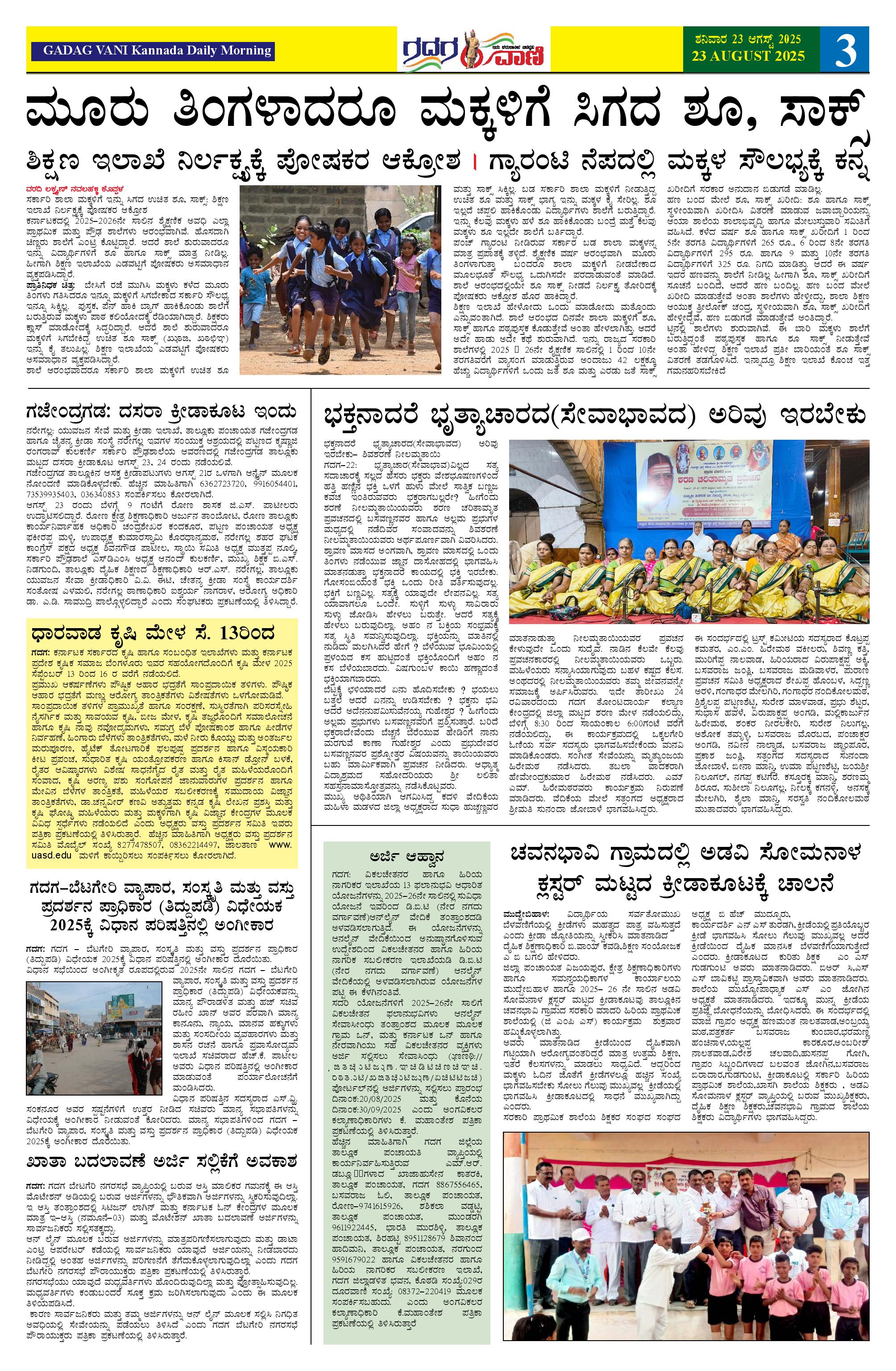 23 AUG 2025 ಗದಗವಾಣಿ Page: 3 August 23, 2025 << First << 3 >> Last >> Page 1Page 2Page 3Page 4Page 5Page 6 × 23 AUG 2025 ಗದಗವಾಣಿ page-1page-2page-3page-4page-5page-6 << First << 3 >> Last >> page-1page-2page-3page-4page-5page-6 page-3